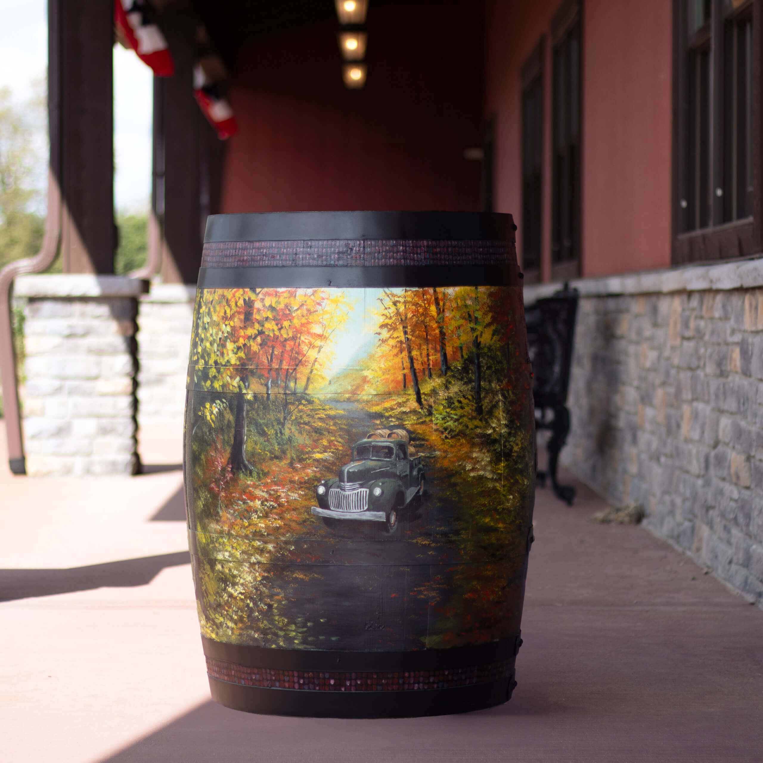 Painted bourbon barrel with autumn scene.